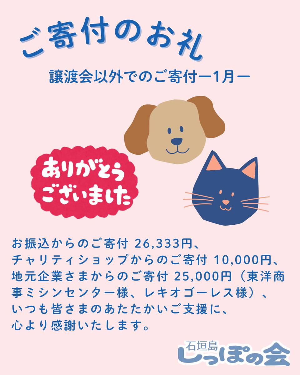 また、1月のお振込みのご寄付¥26,333、チャリティーショップからのご寄付¥10,000、地元企業様より、ご寄付を¥25,000(東洋商事ミシンセンター様、レキオゴーレス様)お心お寄せいただきました。
